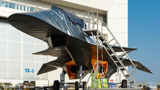 Надо признать, что самолет выглядит очень футуристично. Он выполнен по схеме «летающее крыло» и у него нет хвостового оперения. А если внимательно присмотреться, то видно, что летательный аппарат оснащен сразу тремя(!!!) реактивными двигателями.