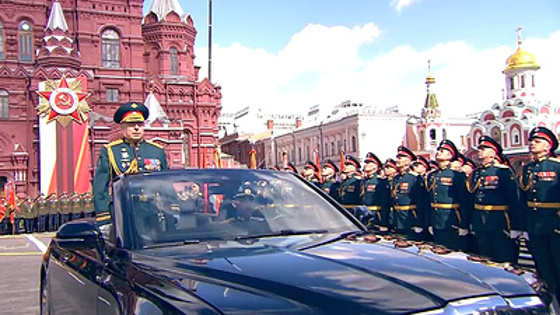 Парад принимает министр обороны РФ Андрей Белоусов, командует парадом главнокомандующий Сухопутными войсками ВС РФ Олег Салюков.