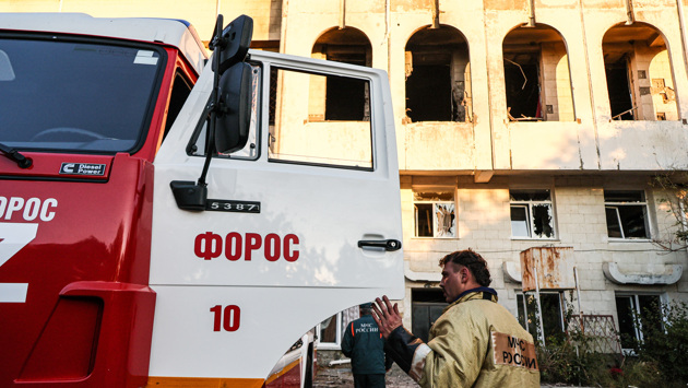 Помимо санатория серьезно пострадало здание школы в Форосе. На опубликованных кадрах видно, что внутри здания обрушился потолок, повсюду лежат обломки выбитых взрывами окон. Также в образовательном учреждении полностью разрушен актовый зал и сильно повреждена библиотека. Пострадал охранник, находившийся в момент атаки в здании.