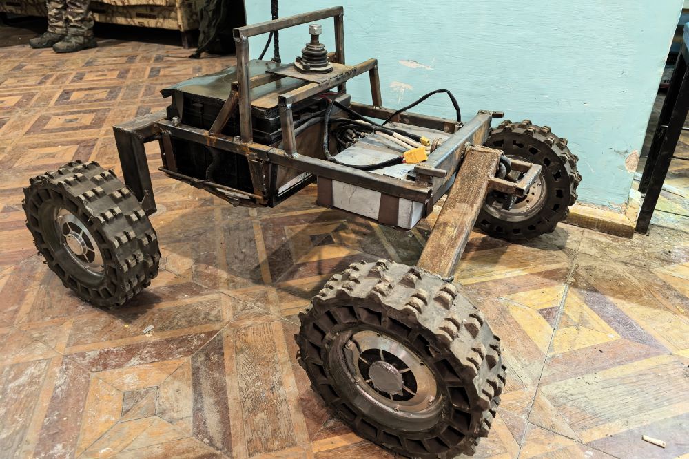 - Да, это наша разработка, - кивает Андрей. - Сами сварили, поставили колеса. Специальная программа под нее пишется. Можно управлять напрямую пультом, можно - через птичку. Поднимаем дрон-ретранслятор, оператор надевает "глаза", берет пульт и дает команды. Будем использовать тележку в условиях повышенной активности дронов, когда нельзя перемещаться ни людям, ни технике. Оператор, сидя в блиндаже, может с помощью такого робота доставить на передовые позиции продукты, воду или боекомплект.