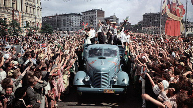 В 1947 году американский писатель Джон Стейнбек отправился в путешествие по СССР вместе с известным фотографом Робертом Капа. Они стали одними из первых американцев, побывавших в Москве со времен социалистической революции. Одним из первых удивительных открытий для них стало время ожидания заказа в столичных ресторанах. Поскольку любая сделка в СССР контролировалась государством, бухгалтерский учет был крайне важен. Официанту было необходимо провести массу операций с документами перед тем, как принести еду гостю. «Официант, принимая заказ, аккуратно записывает его в свою книжку. После он направляется к бухгалтеру и получает талон, который поступает на кухню. Там делается еще одна запись и запрашивается часть блюд. Когда, наконец, выдается еда, то вместе с ней выписывается талон, на котором перечисляются все блюда. Официант относит талон к бухгалтеру, который вручает официанту другой талон, с которым он возвращается на кухню и на этот раз уже приносит еду на стол», — описывает этот процесс Стейнбек. Город в то время ремонтировали к 800-летию Москвы и скорому празднованию 30-й годовщины Октябрьской революции. «Электрики развешивали гирлянды на зданиях, Кремле и мостах. Работа не останавливалась вечером, она продолжалась даже ночью при свете прожекторов. Город прихорашивался, приводился в порядок: ведь это будет первое послевоенное торжество за многие годы», — писал американский прозаик. Однако, несмотря на предпраздничную суматоху, зарубежные гости заметили необычайную усталость в глазах горожан. Женщины, по их словам, очень мало или совсем не пользовались косметикой: их одежда была опрятной, но не очень нарядной. Мужчины все еще носили военную форму, хотя уже не служили в армии: другой одежды у них просто не было. Горы консервов и пирамиды шампанского: на прилавках огромных продовольственных магазинов Москвы лежали горы колбас с Украины, банки с икрой и даже дичь. «Но все это были деликатесы. Для простого русского главным было — сколько стоит хлеб и сколько его дают, а также цены на капусту и картошку. В хороший год, в такой, как мы попали, цены на хлеб, капусту и картофель упали, а это показатель успехов или хорошего урожая. На витринах продовольственных магазинов были выставлены муляжи того, что можно купить внутри. На витринах лежали ветчина, бекон и колбаса из воска, восковые куски говядины и даже восковые банки с икрой», — писал Стейнбек.