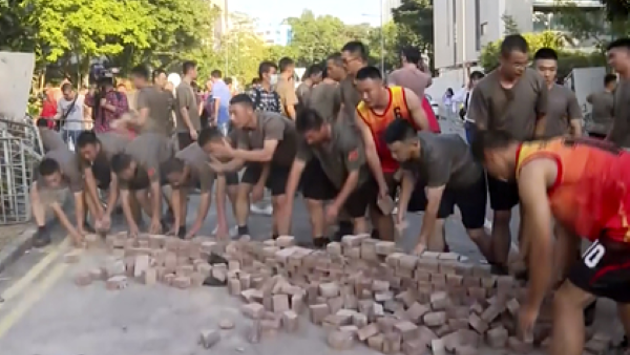 Несколько десятков военнослужащих гонконгского гарнизона вышли на одну из ранее заблокированных демонстрантами улиц рядом с университетом. Они были одеты в шорты и футболки, катили тележки и несли с собой красные ведра.
