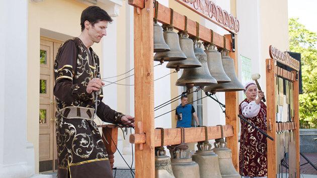 ТАЛЛИНН, 7 июня — Sputnik, Евгений Ашихмин. Передвижная звонница прибыла в шахтерскую столицу Эстонии 6 июня. В этот день в исполнении "Колоколов России" прозвучали звоны древней Руси и Северные звоны московских храмов и Псково-Печерского монастыря. Были также исполнены произведения русских композиторов, использовавших в своем творчестве музыку колокольного звона. Колокола передвижной звонницы освящались в свое время уроженцем Эстонии, Святейшим Патриархом Алексием II, а с 1994 года ансамбль из российской столицы участвует в Рождественских и Пасхальных праздниках в Кремле и Храме Христа Спасителя. Виктор Котельников, Галина Филимонова, Наталья Баранова и Галина Павлович Русские звоны в исполнении "Колоколов России" звучали в Европе и Америке, а в этом году 24 мая в День славянской письменности и культуры, в праздник почитания святых Кирилла и Мефодия, звон "Колоколов России" раздался и на Красной площади в Москве на торжествах, возглавляемых Святейшим Патриархом Кириллом. Фестиваль расширяет границы Четвертый год подряд ансамбль "Колокола России" участвует в Таллинне в международном фестивале "Троицкие звоны", который традиционно приурочен к великому празднику православных — дню Святой Троицы. Однако нынче гости из Москвы расширили границы музыкального форума, который проходил с 3 по 5 июня в Таллинне, и впервые перезвоны в исполнении коллектива из Москвы смогли услышать и жители Ида-Вирумаа. "Особенность нынешнего фестиваля – сочетание разных жанров", — рассказала порталу Sputnik Эстония художественный руководитель ансамбля "Колокола России" Галина Филимонова. В эстонской столице зрителям была представлена программа из выступлений звонарей, хоров академического пения, фольклорных танцевальных коллективов и классического балета. После концерта Галина Филимонова провела для зрителей своеобразный мастер-класс По словам Филимоновой, важно отметить международный характер фестиваля, в котором вместе с Эстонией участвуют три славянских государства — Россия, Украина и Беларусь. Творческую миссию своего коллектива художественный руководитель "Колоколов России" видит в том, чтобы показать многообразие колокольного звона, как церковного, так и звучащего в инструментальной музыке великих русских и зарубежных композитов, создававших композиции для оркестровых колоколов. Например, праздничный звон торжественно звучит в финале увертюры Чайковского "1812 год". Звонарь – служение и призвание На открытии концерта в столице шахтерского края Эстонии руководитель таллиннского фольклорного танцевального коллектива "Непоседы" Наталья Баранова заметила, что "Троицкие звоны" являются единственным в странах Балтии фестивалем, на котором звучат живые колокола. Концерт в Кохтла-Ярве состоялся при содействии депутата Рийгикогу от Ида-Вирумаа Валерия Корба, по словам которого, с праздником Святой Троицы пришла и светлая пора лета. Под руководством Галины Филимоновой мэр Кохтла-Ярве Людмила Янченко и депутат парламента Валерий Корб звоном колоколов открывают концерт в столице шахтерского края Парламентарий поделился своими впечатлениями с журналистом Sputnik Эстония, признавшись, что выступление произвело большое впечатление и на него, и на гостей из России. Зрители на концерте в Кохтла-Ярве "Когда выступаешь на сцене – ты артист. Но пре