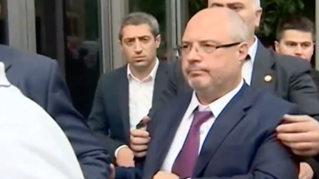 На место прибыла полиция. Российскую делегацию вывели под охраной и проводили к микроавтобусу. Протестующие забросали бутылками и облили водой россиян. После этого микроавтобус направился в аэропорт.