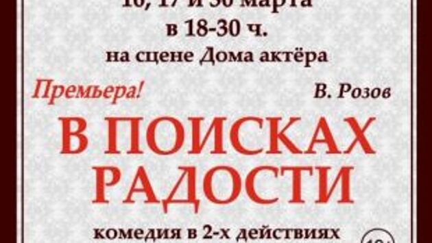 Премьера постановки «В поисках радости» театра «Галёрка» состоится на сцене Дома актера имени Ножери Чонишвили 16 и 17 марта в 18.30, сообщает пресс-служба театра. Спектакль поставлен по пьесе Виктора Розова режиссёром-постановщиком Владимиром Витько, заслуженным деятелем искусства РФ. Художник–сценограф новой постановки – Александра Хохлова, дебютировавшая в этом сезоне в новогоднем спектакле «Щелкунчик». Комедия великого драматурга, насыщенная знаменитым юмором автора, рассказывает о том, что в жизни главная радость - та, которой можно поделиться с другими. За ней не нужно стоять в очереди в магазине, она находится в другом месте - в сиянии глаз любимой девушки, в настоящей мужской дружбе, в семейном уюте. Роль Клавдии Васильевны Савиной исполнит Светлана Романова, Фёдор - Артём Савинов, Татьяны - Екатерина Латыпова, Николая - Сергей Климов, Олега - Егор Витько и Виталий Маркс. Также в спектакле заняты Даниэль Савинова, Владимир Приезжев, Дмитрий Цепкин, Татьяна Майорова Ксения Шабельникова, Александр Андрианов, Павел Кондрашин, Татьяна Васюхина и Анастасия Смычек. 12+