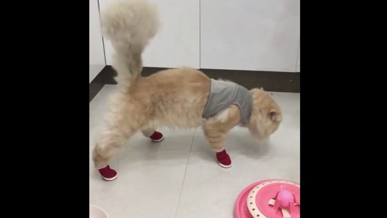 Хозяйка решила обновить гардероб своего питомца и подарила ему уличную обувь. Но, похоже, кот не оценил обновку или пока ещё не привык к ней.