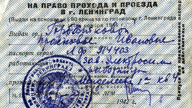 Служебный пропуск. 1942 гг. ЦГА СПб. Ф. 3344. Оп. 1. Д. 2. Л. 9, 10. / Из коллекции Н.Ю. Черепениной.