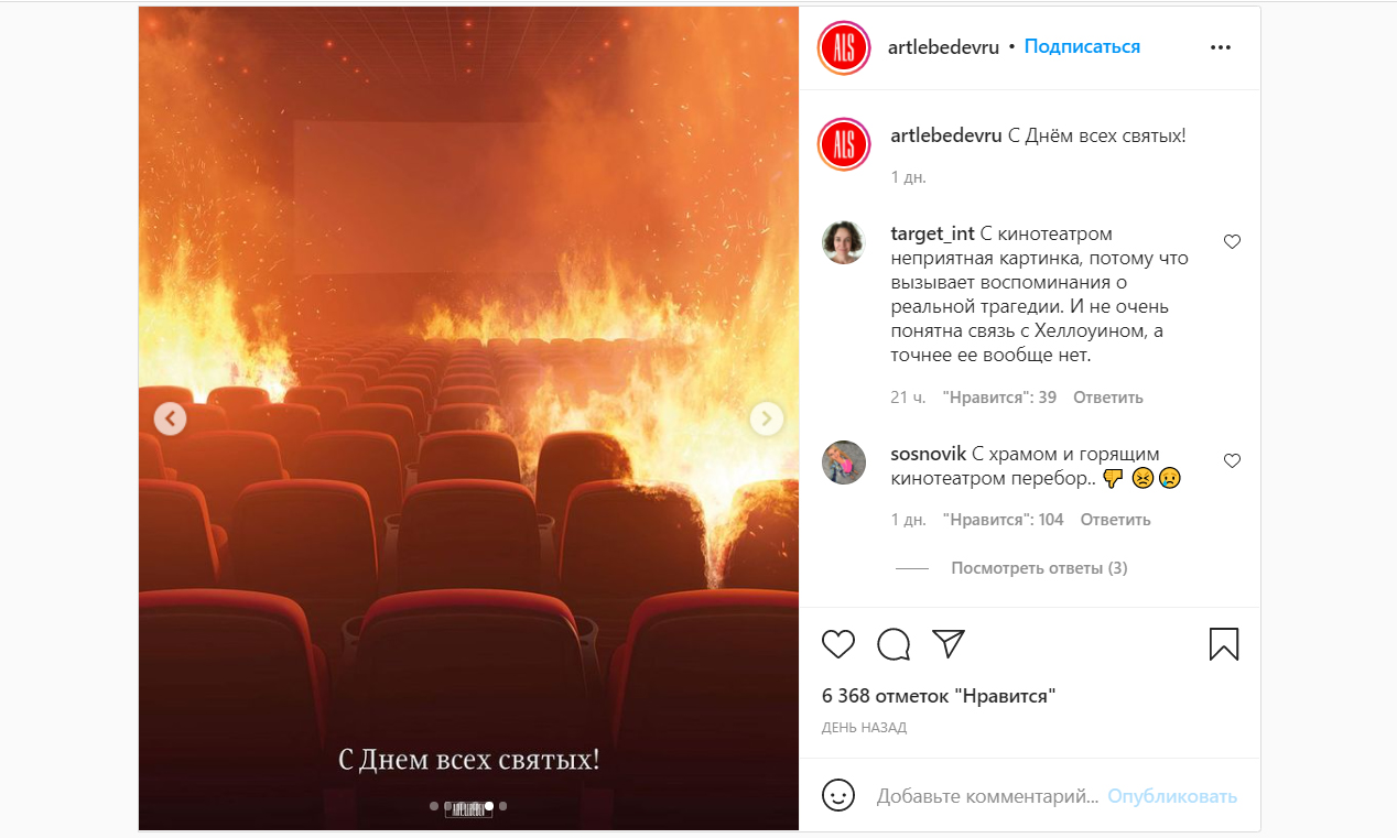 Адвокат, управляющий партнёр AVG Legal Алексей Гавришев прокомментировал «Рамблеру» публикацию компанией «Студия Артемия Лебедева» открытки к Хеллоуину в Instagram, на которой изображен горящий зал кинотеатра.