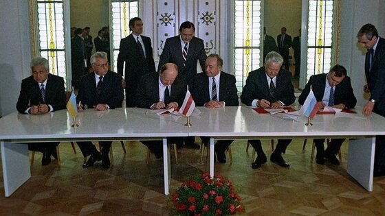 8 декабря 1991 года в Вискулях под Брестом президент РСФСР Борис Ельцин, глава Украины Леонид Кравчук и председатель Верховного совета Республики Беларусь Станислав Шушкевич подписали Соглашение о распаде СССР и о создании Содружества Независимых Государств (СНГ). В соглашении подчеркнута неприкосновенность существующих границ в рамках Содружества, заявлены гарантии их открытости и свободы передвижения граждан. Из республик бывшего СССР в СНГ не вошли Латвия, Литва, Эстония, а Грузия присоединилась лишь в декабре 1993 года.