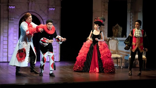В современных условиях ограниченных международных контактов, в особенности со странами Запада, особое звучание приобретают любые гастроли из-за рубежа. Поэтому визит казахстанского театра "Астана-опера" ожидался особо, тем более, что обещан был настоящий эксклюзив – россиниевский фарс "Шёлковая лестница", опера, поистине эксклюзивная для российской оперной сцены. В 1990-е она недолго шла в Камерном музыкальном театре Бориса Покровского (постановка Михаила Кислярова), в прошлом десятилетии к ней обращалось Мерзляковское училище – студенческий спектакль Игоря Ушакова шел в Центре драматургии и режиссуры. Словом, опера, по сути, неизвестная у нас – и это еще дополнительно возбуждало интерес. Правда, спектакль из Астаны уже можно было увидеть ранее – и даже живьем, и не только в Казахстане: в октябре 2019 года он гостил на IV Международном фестивале камерной оперы – такой форум до пандемии регулярно проводился в театре "Санкт-Петербургъ Опера", его гостями были многие иностранные труппы. В пандемийном 2020-м этот же спектакль показывали в рамках онлайн-программы V фестиваля "Видеть музыку". И вот теперь казахстанская "Шёлковая лестница" наконец доехала до Москвы. В столице Казахстана спектакль идет на Камерной сцене "Астана-оперы" – огромный новый театр в сердце новой столицы страны имеет, помимо циклопического основного зала, уютный камерный, который чаще используется как концертный, но где также возможно играть и спектакли, если они решены без сложных сценографических идей. Именно такова астанинская "Шёлковая лестница": спектакль компактный не только по своей продолжительности (одноактный фарс для секстета солистов и без хора), но и по пространственно-визуальному решению. В 2019-м он удачно вписался на крохотную сцену "Санкт-Петербургъ Оперы", теперь не менее органично он вошел на также весьма камерную сцену Центра оперного пения Галины Вишневской. Малые габариты сцены и зала как дают определенные преимущества, так и выявляют некоторые проблемы спектакля. С одной стороны, солистам нет необходимости напрягать связки больше положенного и озвучивать огромное пространство, есть возможность сосредоточиться на тонкостях и изысках россиниевского вокального стиля. Актерская игра тоже – как на ладони, что для комической оперы очень важно, поскольку само действо – очень игровое, и тут публике необходимо быть включенной в любые нюансы и штрихи происходящего на сцене. С другой стороны, эти же преимущества иногда способны обернуться слабыми местами спектакля, что частично и было продемонстрировано на показе в ЦОПе. Привыкшие к иной подаче звука и вообще к стилистически другому репертуару, солисты не всегда оказываются убедительными в россиниевском контексте, и их актерские кондиции местами также не выглядят сильной стороной дарования. Наиболее убедительно и стабильно прозвучали низкие мужские голоса, хотя и они порой своей прямолинейностью и громогласностью не вполне отвечали россиниевской стилистике – тем не менее, и Евгений Чайников (Бланзак), и Рамзат Балакишиев (Дормонт) оказались самыми беспроблемными участниками спектакля, жаль, что партия-роль последнего незначительна. Зато актерски вполне интересен вальяжно-статуарный Чайников – его герой-павлин, вечно красующийся перед всеми, гротескно уморителен. Третий низкий голос 