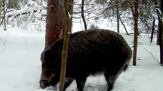 В декабре в Окском заповеднике заметили упитанных кабанов. На снимках видно, как крупные хищники гуляют в лесу по свежевыпавшему снегу в поисках еды.