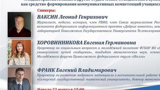В качестве спикеров выступят: Ваксин Леонид Генрихович, заведующий научно-творческой лабораторией Поволжского Государственного Университета Телекоммуникаций и Информатики, журналист, педагог, историк;Хоровинникова Евгения Германовна, проректор по социальным вопросам и молодежной политике ФГБОУ ВО "Самарский государственный университет путей сообщения", кандидат экономических наук, основатель и первый директор Молодежного форума Приволжского федерального округа "iВолга";Франк Евгений Владимирович, проректор по развитию кадрового потенциала и воспитательной работе ФГБОУ ВО "Самарский государственный технический университет", доктор экономических наук.