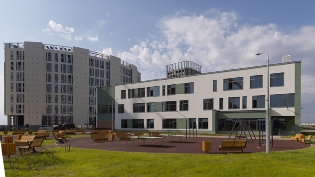 Образовательное учреждение возведено на намывных территориях в составе ЖК "Морская набережная". Строительство в рамках соглашения с городом осуществляла "Группа ЛСР".