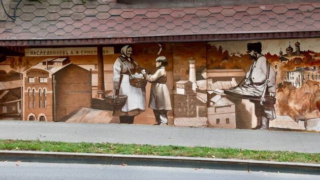 Мурал украсил стены построек напротив кремля на Зеленском съезде. Граффити показывает жизнь нижегородских купцов, извозчиков, торговцев на рубеже веков.
