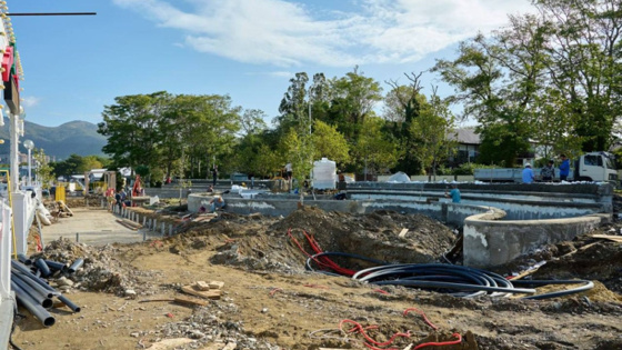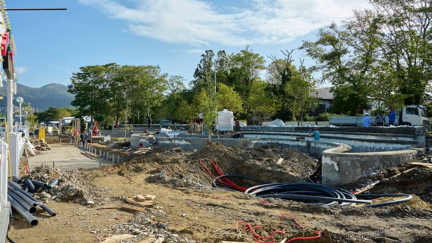 Сейчас вся территория перепахана, работает техника: идет установка системы автоматического полива, подводка коммуникаций, укладка плиточного мощения. На объекте работает более 50 человек и шесть спецмашин.