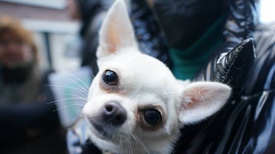 На размещенном снимке видно, как животное породы чихуахуа светлого серо-бежевого оттенка одето в изделие из меха. При этом на шее собаки был размещен поводок.