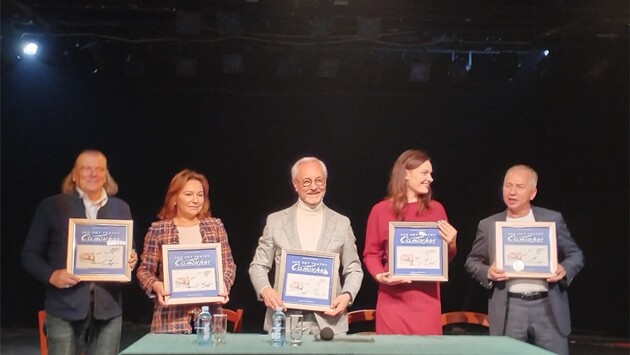 Ведущий церемонии напоминает нам ее смысл. Церемония памятного гашения - это презентация государственного знака почтовой оплаты с целью привлечения внимания общественности. И общественность в лице журналистов на "Чердаке Сатиры" была начеку. Ровно в 12.00 артисты расписываются на официальных бумагах и ударяют по специальному штемпелю. Кстати, для гашения марки был изготовлен специальный сувенирный штемпель. На нем указана дата гашения - 26 ноября 2024 года. Этим штемпелем ставится оттиск, а далее каждый конверт подписывается участниками церемонии. И вот марка погашена. И какая красивая! На ней — четыре легендарные маски, символизирующие театральные жанры, а также историческое здание, увенчанное узнаваемым круглым куполом. Такие изображения выбраны для маленькой марки — настоящего произведения искусства, выпущенной тиражом в 500 тыс экземпляров. В будущем, как надеются артисты, она станет настоящим сокровищем для филателистов. Ведь в театре провели конкурс, выбирая художника. Победил лучший. И о театре теперь смогут узнать граждане нашей страны в самых ее отдаленных уголках. А как появилась эта идея выпустить марку в честь столетия театра? - В принципе, эта идея не новая, - отвечает мне Герасимов. - Я знал, что многие учреждения и мощные организации практикуют это, и успешно. Поэтому решил, почему бы и нет? Ведь столетие - значимое событие в творческой биографии легендарной Сатиры! Мы счастливы возможности "запечатлеть" историю и передать ее частичку тем, кому и посвящены все сто лет существования театра — зрителям. Символизм деталей рисунка художника Капранова выбран неслучайно. Это — связь поколений. Напомним, что история театра началась в октябре 1924 года, в подвале дома Нирнзее, где располагались кабаре "Летучая мышь" и "Кривой Джимми". Первым спектаклем театра была постановка "Москва с точки зрения". Позже театр не раз менял свою локацию, но всегда оставался популярным у москвичей — благодаря современному подходу, острым пьесам, юмору и, конечно, выдающемуся коллективу. В разные годы в труппе театра работали знаменитые актеры: Рина Зеленая, Георгий Менглет, Татьяна Пельтцер, Вера Васильева, Ольга Аросева, Владимир Хенкин, Михаил Державин, Андрей Миронов, Спартак Мишулин, Анатолий Папанов, Александр Ширвиндт и другие великие артисты. Евгений Герасимов поздравляет присутствующих и коллектив театра с событием, напоминая, что марка уже запущена в продажу: - Я уверен что она будет пользоваться огромным успехом не только у москвичей, но и по всей стране. Лет через сто ей цены не будет! Это же столетняя история большого талантливого коллектива. Театр сатиры — это яркое созвездие, в котором каждая звезда — бриллиант. А сто лет ведь не часто случаются. И к 1 декабря мы подготовили мощный юбилейный концерт. Это будет настоящий праздник, театрализованное представление в метро. В этот день метро запустит наш поезд с портретами артистов и фрагментами афиш. Мы все пойдем на открытие нашего поезда, будет весело и интересно. И москвичи узнают, что Театр сатиры отмечает свой юбилей.