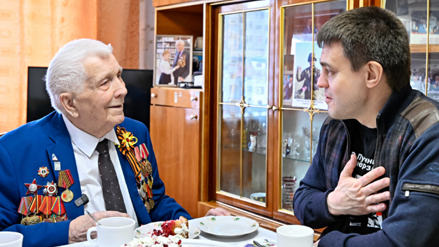 Знаменательную дату Алексей Дмитриевич встретил в окружении родных - дочери, внуков и правнуков. "Он - наша связующая ниточка, это величина номер один, наш мозг, наше сердце, наша сила, наше все", - рассказала Надежда Алексеевна, дочь юбиляра.
