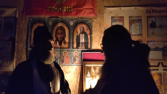 Под поухивания учебных разрывов зажигаются свечи, вешаются на стену иконки. В пустом здании то ли склада, то ли зернохранилища мечутся огни свечей, священники повязывают себе поручи, а на стоящие в несколько рядов самодельные скамейки начинают молча рассаживаться входящие в высокую дверь бойцы.