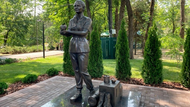 Скульптуру девушки-волонтера с гуманитарной помощью у ног установили в парке культуры и отдыха имени Октября. Церемония проходила в торжественной обстановке с почетным караулом.