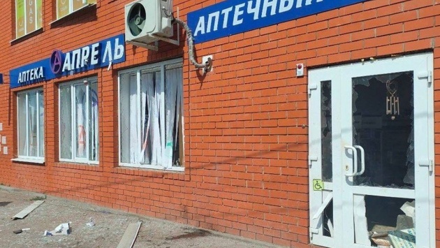 В здании коммерческого объекта повреждены фасад и остекление. Повреждения получили также находившиеся рядом с ним маршрутный автобус и три автомобиля.