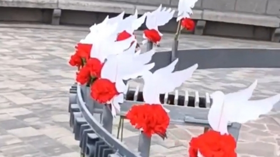 Памятник мирным жителям Сталинграда, ставшим жертвами варварских бомбардировок города в период с 23 по 28 августа 1942 года, украсили живыми гвоздиками с закрепленными на них бумажными белыми голубями.