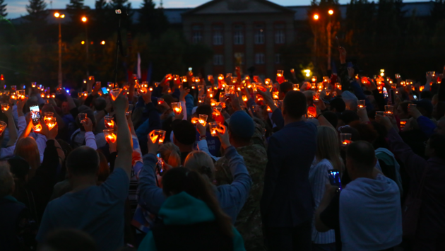 В 22:30 у Монумента также прошла акция «Огненные картины», где зажглись тысячи свечей в память о тех, кто не вернулся с войны.