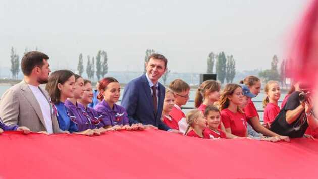 В этот знаменательный день жители Воронежа собрались на дамбе Чернавского моста, чтобы развернуть российский триколор длиной в сто метров.