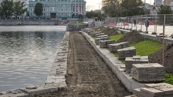 В центре Екатеринбурга стартовали работы по благоустройству пешеходной зоны на набережной Городского пруда. На одном из участков уже снята старая плитка, подход к воде и прибрежному газону огражден металлическим забором.