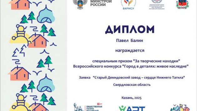 Житель Свердловской области Павел Балин получил специальный приз Всероссийского конкурса «Город в деталях: живое наследие», организованный Минстроем РФ. Его проект «Старый Демидовский завод — сердце Нижнего Тагила» был отмечен в номинации «За творческие находки». Всего жюри было рассмотрено более тысячи заявок от 75 субъектов России.