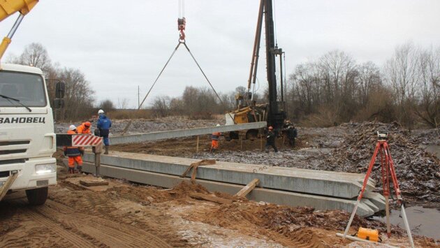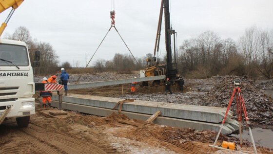 Строители на днях забили пять 13-метровых свай. Теперь в течение нескольких недель подрядчик будет проводить испытания. После этого рабочие смогут продолжить забивать сваи для будущих опор, две из них установят на берегу, другие две — в русле реки.