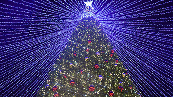 Это 17-метровая искусственная ель, окруженная четырьмя елями поменьше. Она весит 1,28 тонны, в ней 1 400 веток, на которых повесили 660 золотистых шаров, над елью расположена шатровая иллюминация.