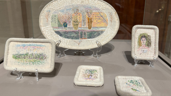 Но вернемся к выставке, которая достойна внимания, несмотря на свою камерность и скромность. В центре внимания — фигура художницы-монументалистки Александры Лукашевкер. Ее творческий путь — яркий пример того, как печальные и даже трагические жизненные обстоятельства можно трансформировать себе во благо. Известно, например, что она приложила свою талантливую руку к мозаикам московского метро, но гораздо важнее оказалась другая сторона ее творчества. В 1980-е годы Александре Давыдовне поставили непростые диагнозы — катаракта и глаукома, заниматься любимым делом больше нельзя. Работать разрешили лишь с маленькими вещами (впрочем, только с ними это и было возможно); и художница нашла выход — вышивка! Но она не стала просто вышивальщицей, наделив распространенный вид рукоделия большим художественным достоинством. Ее работы, как отмечают коллеги, выполнены в живописной технике; несмотря на то, что это вышивка, каждый стежок напоминает прикосновение тончайшей кисти с краской к холсту, а не просто нить.