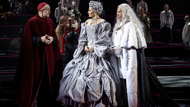Ольга Кабо когда-то сыграла в продолжении киношных "Трех мушкетеров" молодую герцогиню де Шеврез - в родном театре она стала королевой. Хороша во всем - в великолепных белых платьях с оригинальными подвесками, в дуэтах с ребячливым Королем, с хитрым любовником Бекингемом. Ею искренне восторгается Констанция (Юлия Бурова, в другом составе Анастасия Белова). Финал первого акта - из лучших сцен в спектакле: Анна Австрийская застывает в величественном безмолвии, а ее наперсница выходит в зал и просит у зрителей перо, которым королева могла бы подписать письмо герцогу Бекингему.