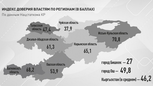 Кстати, самый низкий уровень доверия к госструктурам зафиксирован в Бишкеке (27 баллов). Самый высокий - в Иссык-Кульской области (70,8).