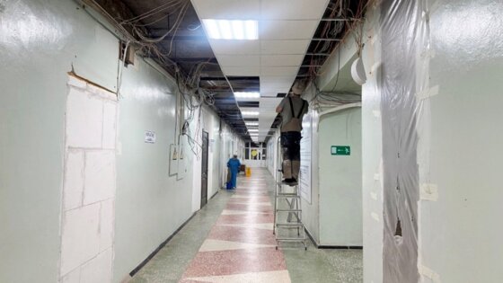 В 1-м хирургическом отделении клинической больницы № 6 имени Г. А. Захарьина идет ремонт внутренних помещений. На данный момент здесь смонтировали подвесной потолок, заменили розетки и выключатели, установили светильники.