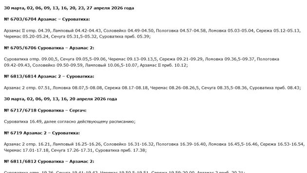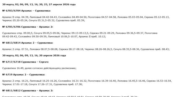 Кроме того, маршруты некоторых электропоездов из Арзамаса и Сергача будут сокращены до станции Суроватиха. Более подробную информацию можно найти в карточках ниже: