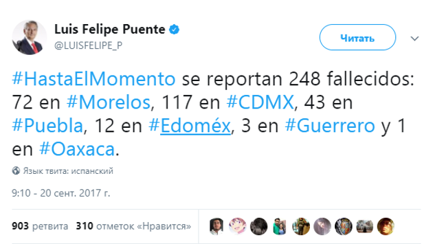 Во время землетрясения в Мексике погибли 224 человека. Таковы последние данные, которые сообщает правительство страны, передает НСН. Из-за землетрясения в Мехико обрушилась школа. В результате погиб 21 ребенок. Землетрясение произошло 19 сентября. Мощность толчков составила 7,1 балла по шкале Рихтера. Эпицентр землетрясения был зафиксирован на юго-востоке страны в 111 километрах от Мехико.