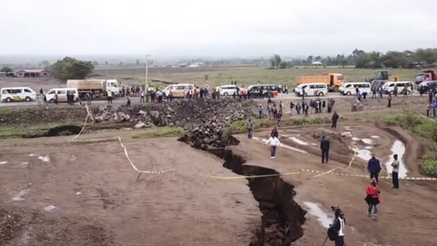 На видеозаписи видно, что большая трещина прошла по поверхности кенийской долины, затронув, помимо прочего, и объекты инфраструктуры, например, перекресток дорог, тем самым затруднив движение по нему.
