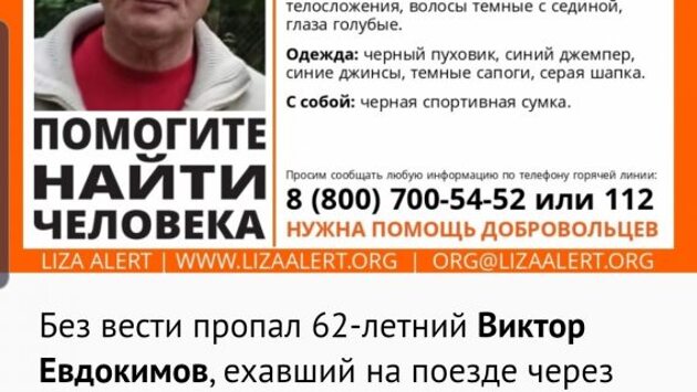 Ехавший на поезде через Саратов 62-летний Виктор Евдокимов пропал без вести. Об этом сообщают волонтеры «Лиза Алерт». Приметы: рост 180 сантиметров, нормальное телосложение, волосы темные с сединой, глаза голубые. Был одет в черный пуховик, синий джемпер, джинсы этого же цвета, темные сапоги и серую шапку. С собой у него была черная спортивная сумка. С 5 января о нем ничего не неизвестно. В тот день около 16:00 он последний раз выходил на связь, находясь в поезде «Кисловодск – Екатеринбург». Предполагается, что он мог потеряться в одном из городов следования.
