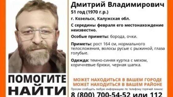 Поисково-спасательный отряд "ЛизаАлерт" разыскивает 51-летнего Ткачева Дмитрия Владимировича, проживающую в городе Козельск Калужской области. С середины февраля его местонахождение неизвестно. Особые приметы: борода, очки. Приметы: рост 164 см, нормального телосложения, волосы русые с рыжиной, глаза голубые. Одежда: тёмно-синяя куртка с мехом, коричневые брюки, чёрная шапка. Всех, кто что-либо знает о местонахождении Ткачева Дмитрия Владимировича, просим сообщить по телефону 8-800-700-54-52 (на территории РФ звонок бесплатный). Фото: Поисково-спасательный отряд "ЛизаАлерт"