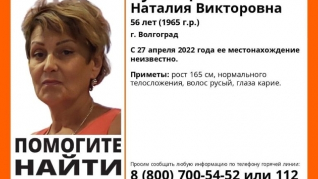 К поискам 56-летней Наталии Викторовны Кузнецовой присоединились волонтеры. Женщина бесследно исчезла 27 апреля и с тех пор на связь не выходила. Известно, что рост пропавшей составляет 165 см, телосложение нормальное. У Наталии волосы русого цвета, глаза карие. Всех, кто может знать местоположение разыскиваемой, просят связаться с Диадорой (Натальей) по номеру телефона: 89061679444. Алина Подрезова. Фото: vk.com/la_volgograd
