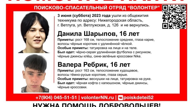 Двух 16-летних подростков разыскивают в городе Ветлуга. Об этом сообщает поисково-спасательный отряд «Волонтер». 3 июня, в субботу, подростки ушли из общежития техникума на улице Ветлужской и с тех пор пропали. 16-летний Данила Шарыпов имеет среднее телосложение, рост 168 см, черные короткие волосы с удлинённой чёлкой и карие глаза. У него есть татуировки на лице и на теле. На момент пропажи был одет в чёрно-серую удлинённую футболку с рисунком, чёрные джинсы клёш и сине-зелёные кроссовки. С ним был 16-летний Валера Ребрик. Имеет худощавое телосложение, тёмно-русые короткие волосы, рост 163 см и серые глаза. Есть веснушки на лице и татуировка на руке. Последний раз юношу видели одетым в черную кофту с капюшоном, чёрные джинсы и кроссовки. При имеющейся информациио местонахождении подростков просят сообщать на горячую линию отряда ПСО «Волонтер» 8-(831) 291 – 51-51 или инфоргу поиска: +7 – 904-785 – 10-55 Наталья (Волга). Ранее на сайте pravda-nn.ru сообщалось, что 18-летняя девушка, которую четыре дня искали в Нижнем Новгороде, погибла.