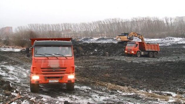 Там, где раньше была вода, теперь возвышаются черные сопки. Рабочие приступили к новому этапу расчистки пруда у клинической больницы № 6. Большую часть жидкости из водоема спустили, каждый день КамАЗы вывозят десятки тонн грунта.