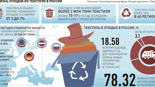 Более 78% отходов текстиля, которые образуются в России, можно переработать, но в стране собирается только около 1% таких отходов. В Европе в среднем этот показатель составляет около 38%. Такие данные приводятся в исследовании благотворительного фонда "Второе дыхание" и Группы "ЭкоЛайн".