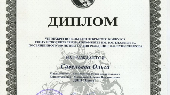 Учащиеся класса преподавателя Р. В. Калиниченко из детской школы искусств «Центр» района Кузьминки ярко дебютировали на межрегиональном открытом конкурсе исполнителей на блокфлейте имени Блажевича. На престижный просмотр съехались участники из специализированных музыкальных школ со всей России. — Для наших ребят это был первый серьезный музыкальный конкурс, который в итоге стал успешным. По итогам конкурса Ольга Савельева и Лев Гольдберг стали дипломантами, — отметила представитель школы. Поздравляем учащихся, их преподавателя и концертмейстера Ю. В. Молчанову с достойным выступлением. (вт)