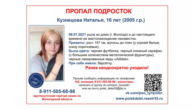 Наталья Кузнецова ушла из дома в Вологде (точный адрес не сообщается) 8 июля и до настоящего времени ее местонахождение неизвестно. До этого случая девушка неоднократно уходила из дома.