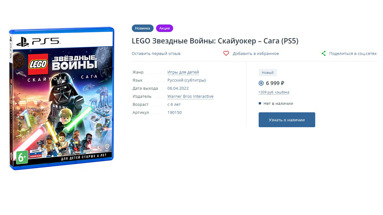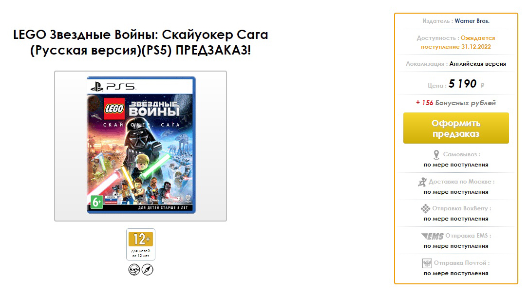 На площадке Videoigr.net цена ниже, — 5 190 рублей — но самой игры нет в наличии: пока можно лишь оформить предварительный заказ. Точной даты прихода диска на склады тоже нет. Вместо нее на странице игры висит заглушка, которая гласит, что поставка ожидается 31 декабря 2022 года.