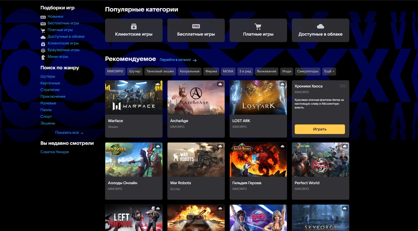Игровой магазин Mail.ru — ведущая цифровая платформа по продаже игр на территории РФ. Если рассматривать исключительно российские площадки, то размер его каталога и функционал игрового клиента вне конкуренции. Ассортимент free-to-play игр насчитывает десятки различных тайтлов, от ММО (Lost Ark, ArcheAge, Perfect World, «Аллоды Онлайн») до сетевых шутеров (Warface, Enlisted, Cross Fire) и всяческих казуалок. Платные ключи для Steam и других платформ тоже в наличии: новинки выходят в продажу с задержкой, зато приобрести их можно без какой-либо головной боли.