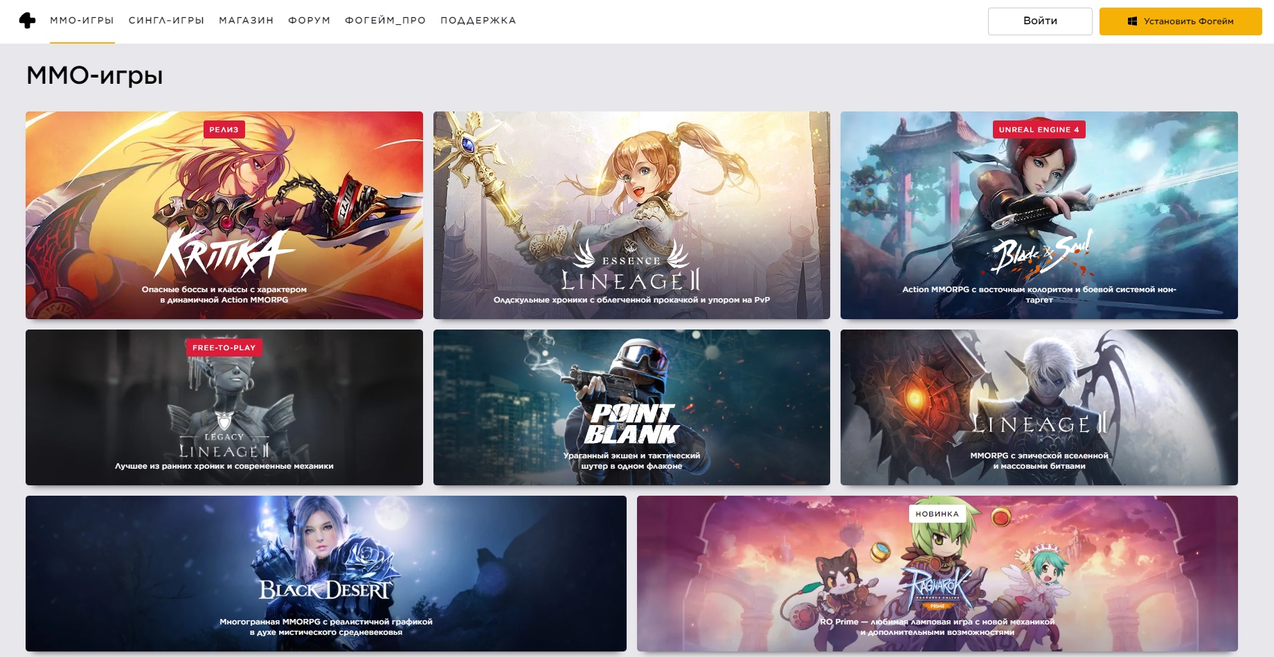 Отечественная платформа «Фогейм» специализируется на локализованных версиях популярных бесплатных ММО — таких как Lineage II, Black Desert и Blade & Soul. Кроме того, в магазине можно найти ключи на различные игры для Steam и Uplay: сейчас каталог насчитывает всего несколько десятков тайтлов, но библиотека постепенно пополняется новыми проектами.